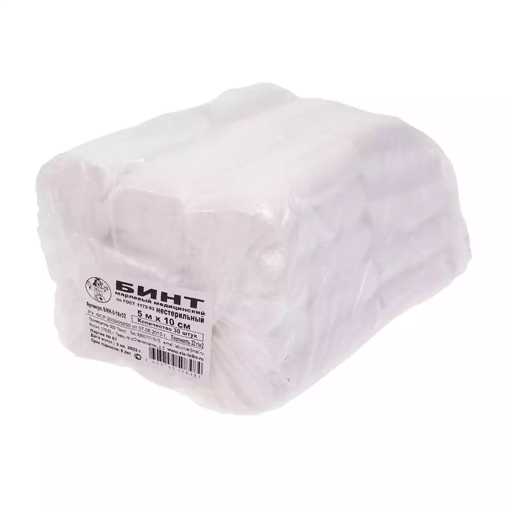Бинт марлевый, размер 5*10см, плотность 32г/м2, нестерильныйЛейко (РОССИЯ), 30 шт