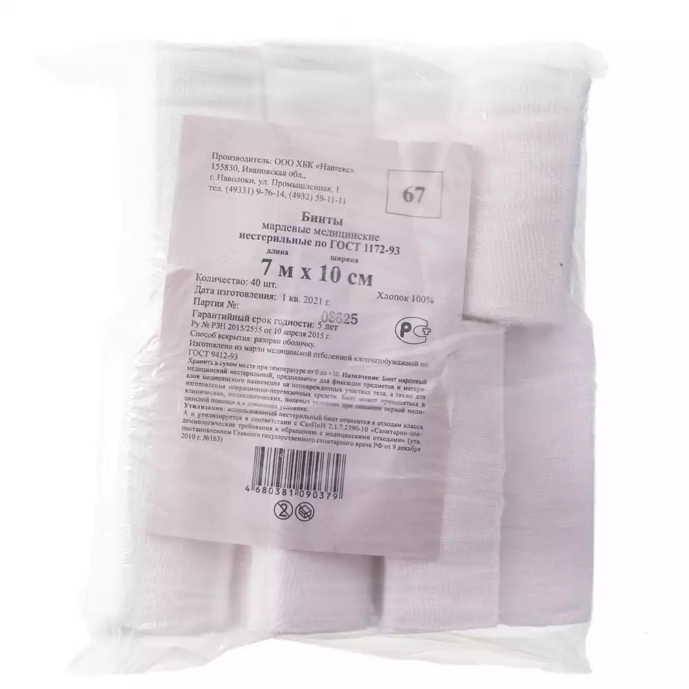 Бинт марлевый, 7м*10см, плотность 36г/м2, нестерильныйНавтекс ХБК (РОССИЯ), 40 шт