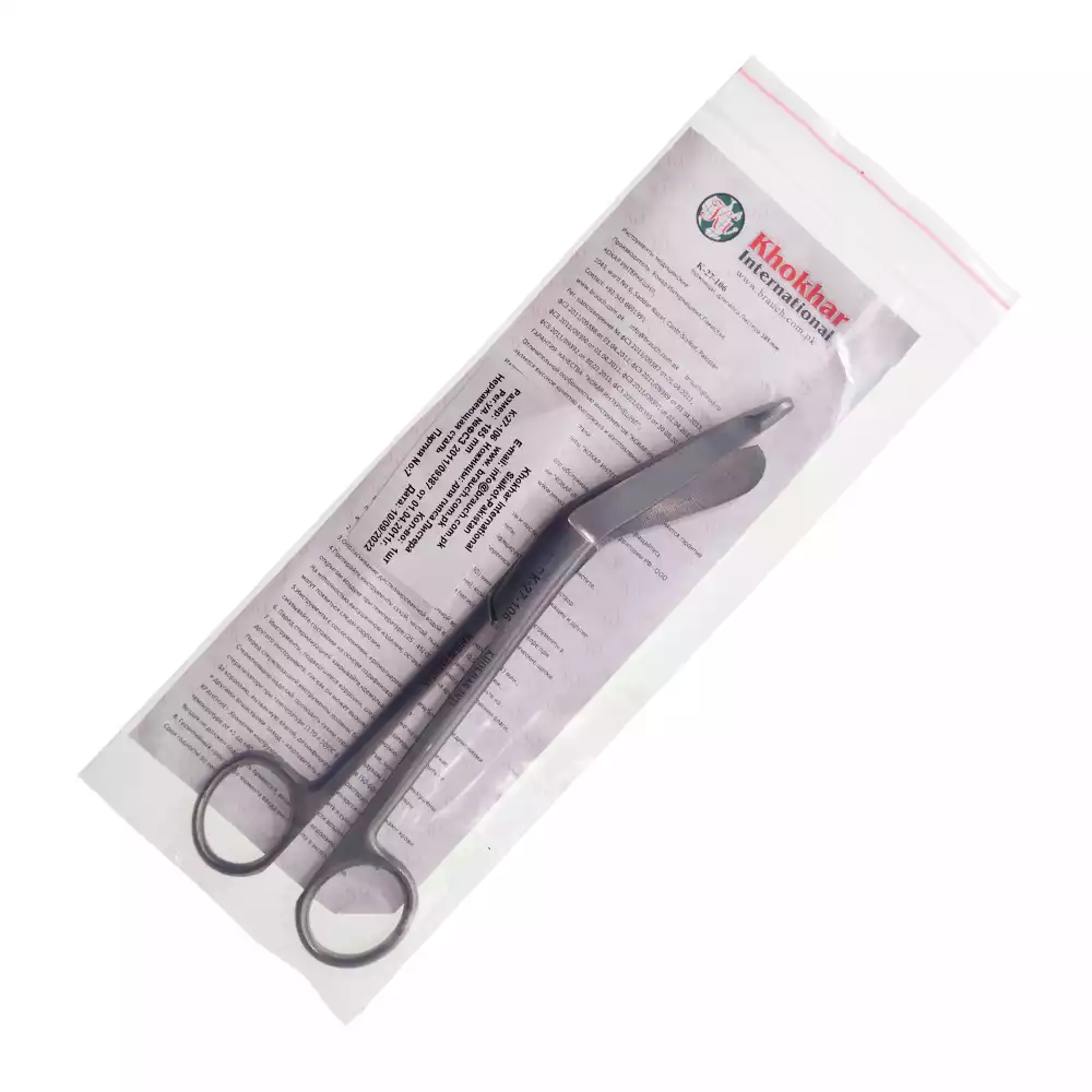 Ножницы К-27-106 тупоконечные горизонтально-изогнутые, для разрезания повязок, с пуговкой, длина 185мм, аналог Н-14Khokhar International (ПАКИСТАН)
