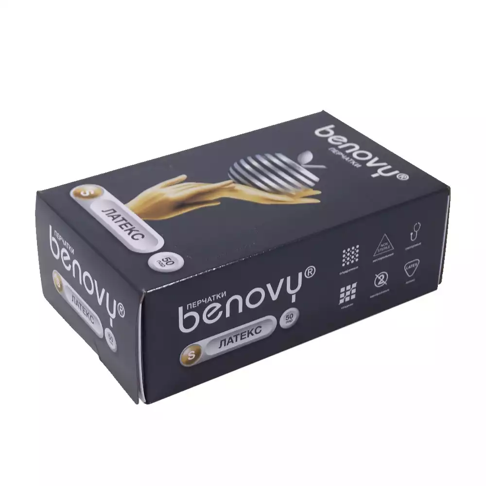 Перчатки BENOVY, размер S, латексные, опудренные, гладкие, нестерильные, манжета с валиком, упаковка 50 парSri Trang Gloves (Thailand) Public Company Limited (ТАИЛАНД)