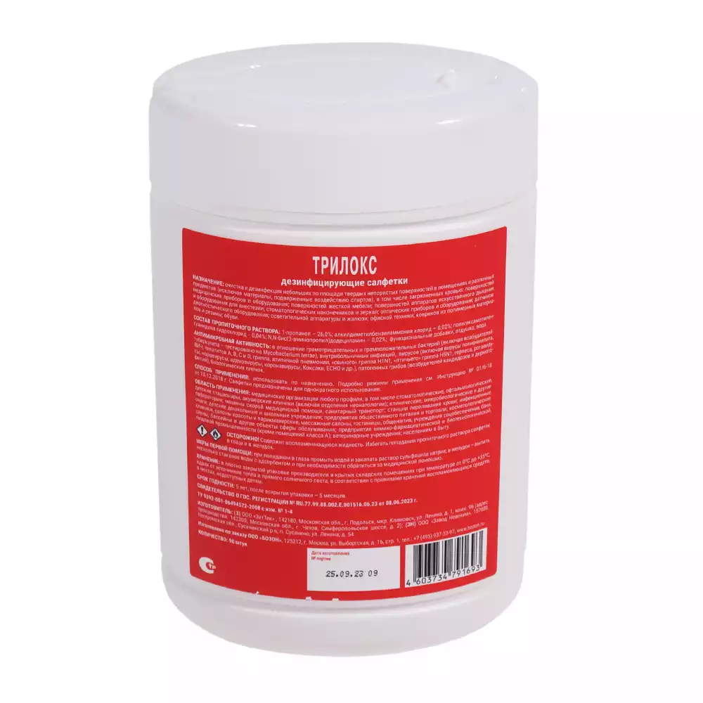 Готовые к применению влажные дезинфицирующие салфетки из белого нетканого материала, равномерно пропитанные дезинфицирующим раствором ТРИЛОКС с минимальным эффективным содержанием спирта для быстрой дезинфекции небольших по площади поверхностей и оборудования. Салфетки ТРИЛОКС обладают антимикробной активностью в отношении грамотрицательных и грамположительных бактерий (включая возбудителей туберкулеза - тестировано на Mycobacterium terrae), внутрибольничных инфекций, вирусов (включая вирусы полиомиелита, ВИЧ, гепатитов А, В, С и D, гриппа, атипичной пневмонии, «свиного» гриппа H1N1, «птичьего» гриппа H5N1, герпеса, ротавирусы, норовирусы, аденовирусы, коронавирусы, Коксаки, ЕСНО и др.), патогенных грибов (возбудителей кандидозов и дерматофитий), биологических пленок.